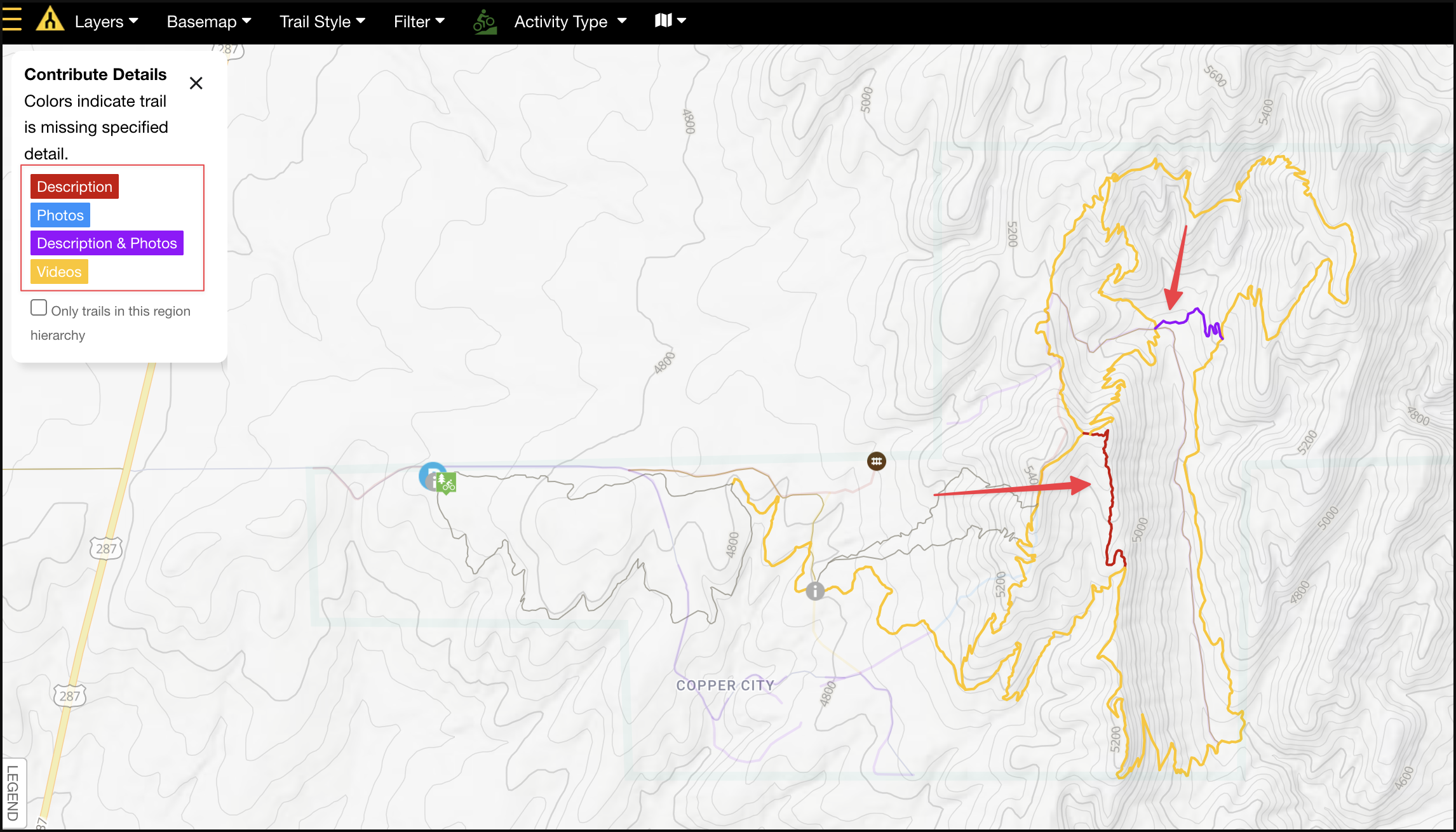 By using the 'Trail Style' > Contribute Details filter, you can help contribute to trails that are missing key points, such as a description, photos, a description and photos, or videos. This can be especially useful if you are a region admin and wish to see which trails are missing important information.