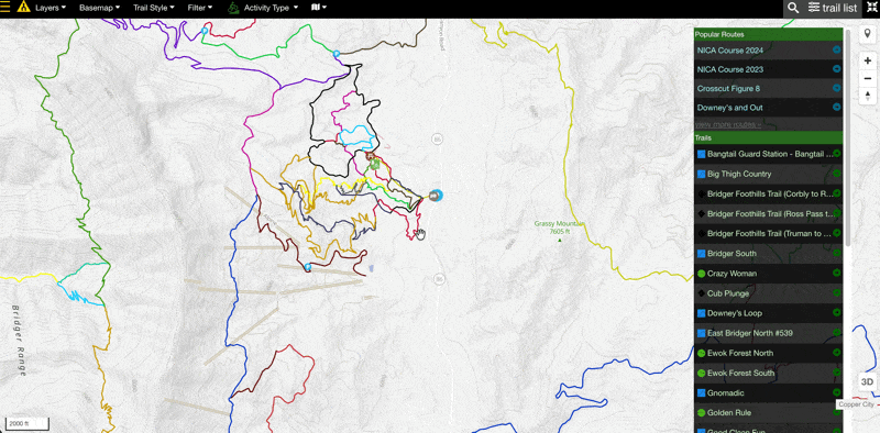 On the Trailforks basemap, you can view trails by color, blaze color, or you can deemphasize the trails so that you're better able to see layers and other features on the map.