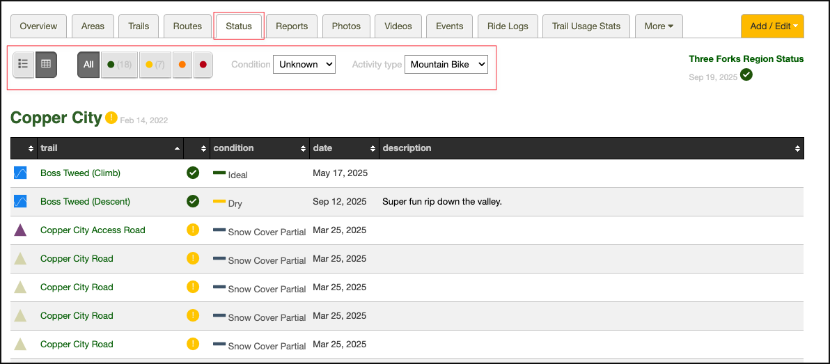 Under the Status tab, you can view trail statuses & filter by condition: